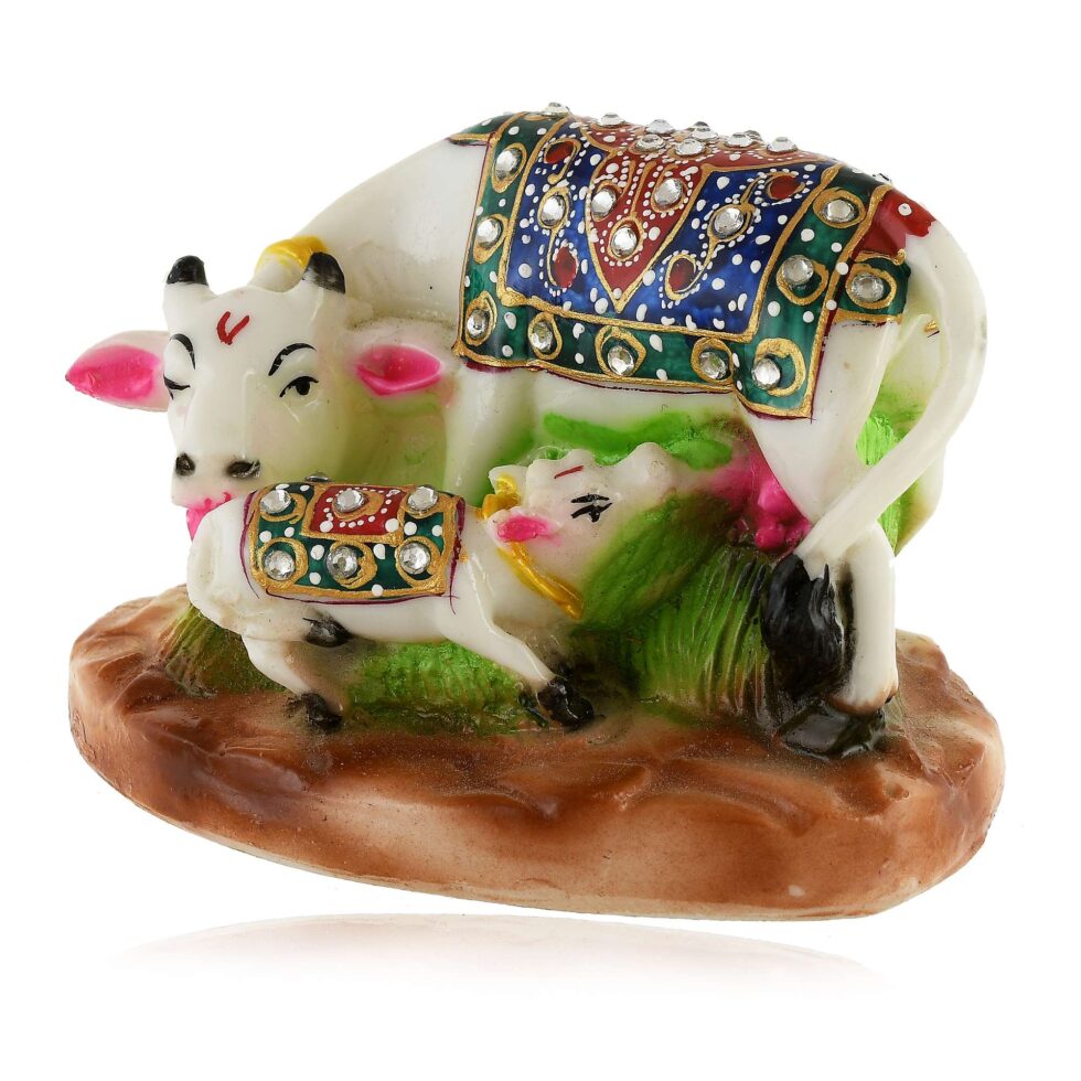 This beautiful white marble statue depicts a Kamdhenu cow and her calf. The Kamdhenu is a sacred cow in Hinduism, believed to be the source of all desires and capable of granting wishes. This statue is hand-carved from marble and would be a perfect addition to your home or office, or as a gift for someone special.